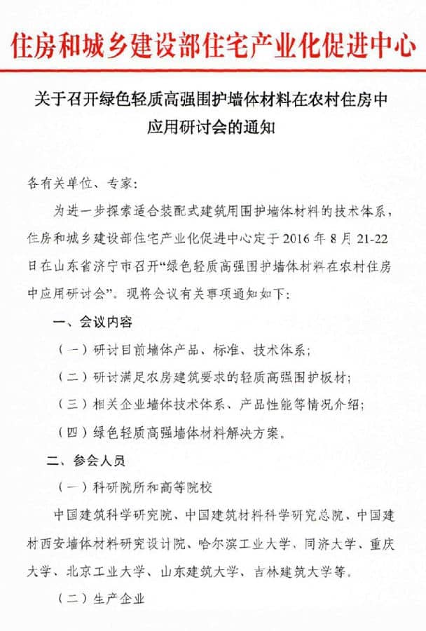 為進一步探索適合裝配式建筑用圍護墻體材料的技術體系,住房和城鄉(xiāng)建設部住宅產業(yè)化促進中心定于2016年8月21-22日在山東濟寧市兗州區(qū)召開“綠色輕質高強圍護墻體材料在農村住房中應用研討會”。