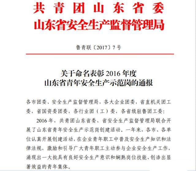 為激勵引導(dǎo)全省廣大青年職工強化安全生產(chǎn)意識,提高安全生產(chǎn)技能,參與安全生產(chǎn)管理,2016年共青團(tuán)山東省委、山東省安全生產(chǎn)監(jiān)督管理局聯(lián)合開展了山東省青年安全生產(chǎn)示范崗創(chuàng)建活動。山東天意機械股份有限公司新產(chǎn)品班組榮獲2016年度“山東省青年安全生產(chǎn)示范崗”